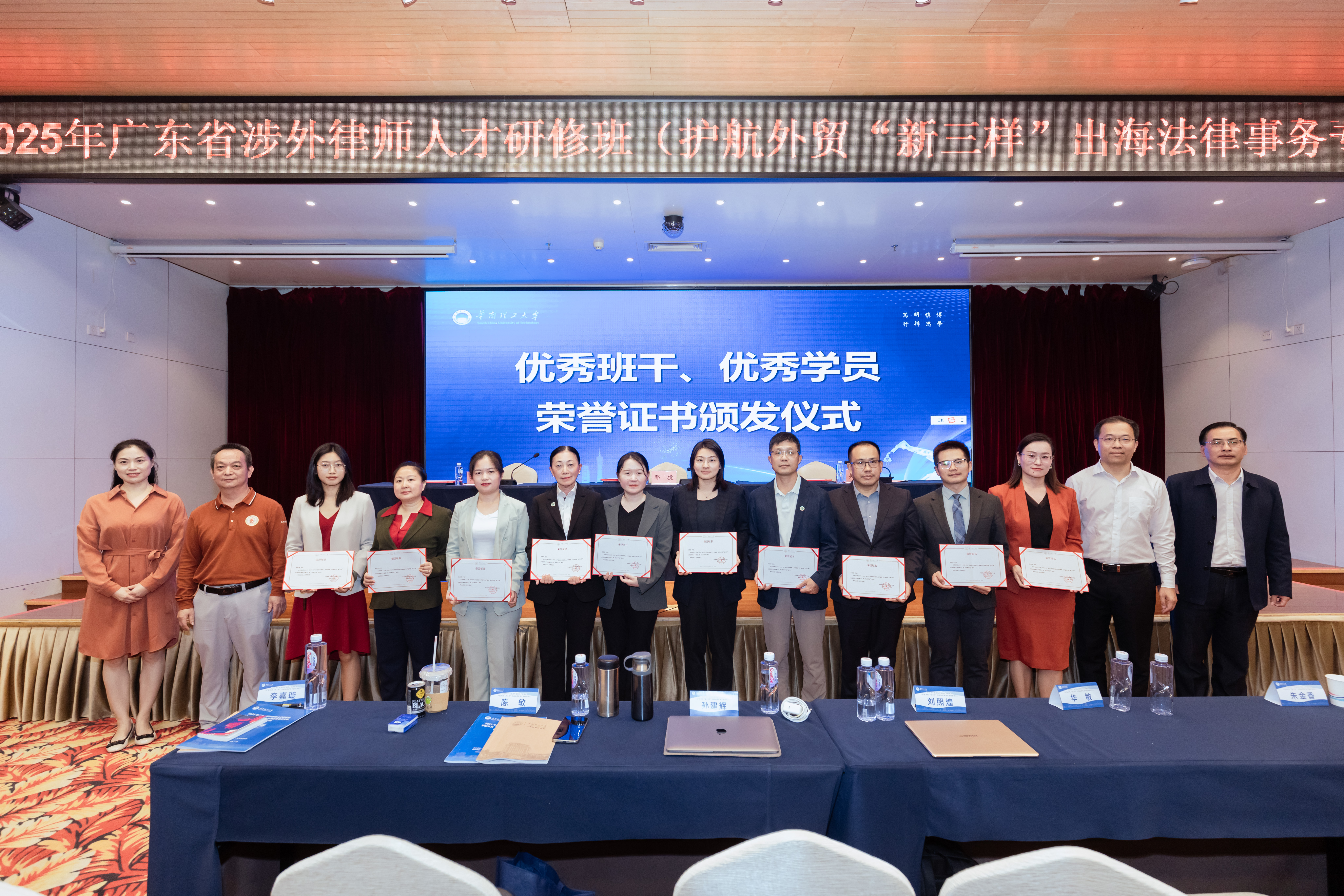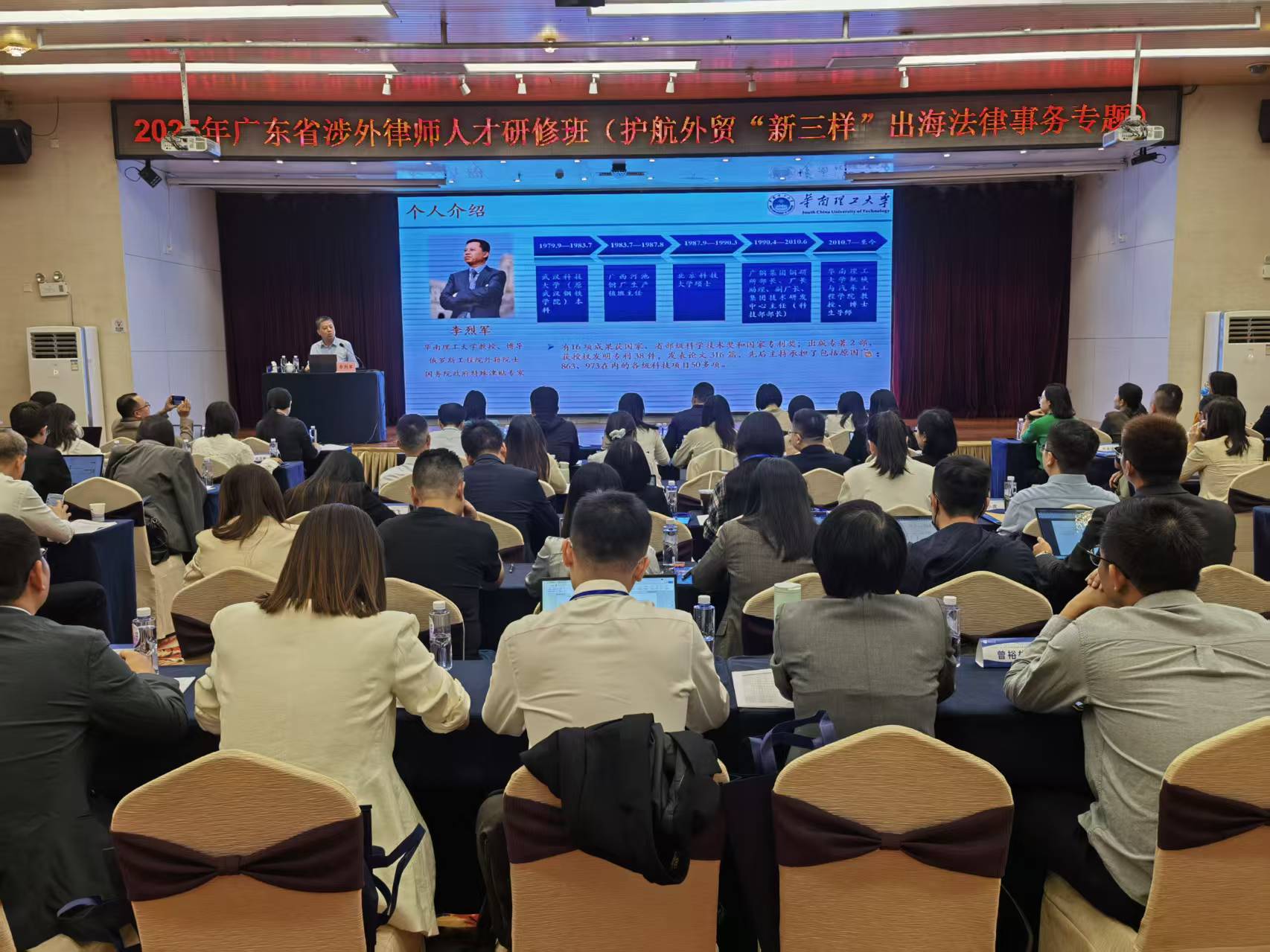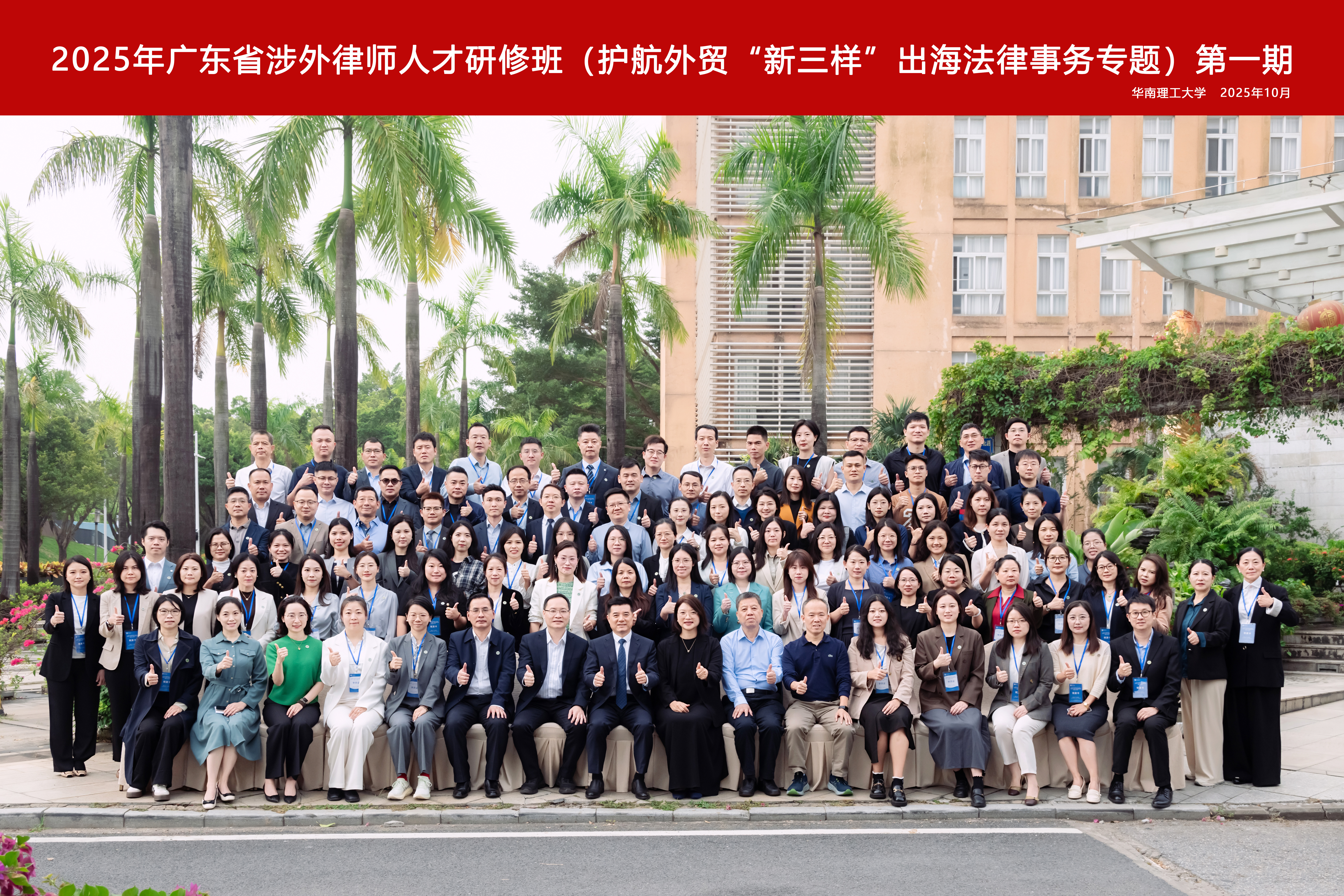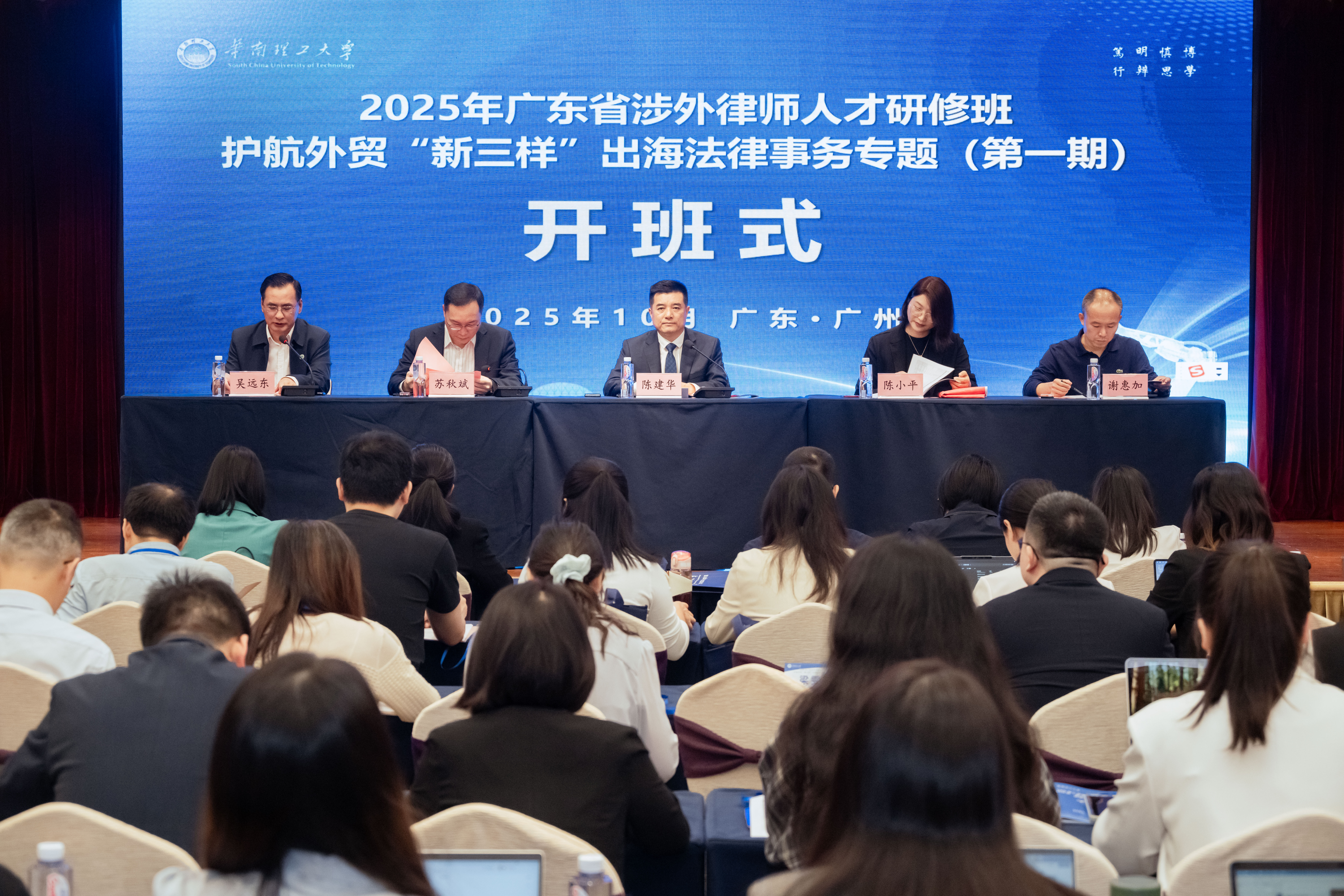近日,由广东省司法厅、广东省律师协会主办,华南理工大学承办,为期10天的2025年广东省涉外律师人才研修班(护航外贸“新三样”出海法律事务专题①)在华南理工大学大学城校区圆满落幕。广东省律师协会副会长陈建华、副秘书长邓捷,华南理工大学继续教育学院院长苏秋斌、副院长吴远东,法学院党委书记陈小平、副院长谢惠加等出席开班(结业)式活动,来自全省的100名涉外法治工作者和涉外律师参加研修班学习。